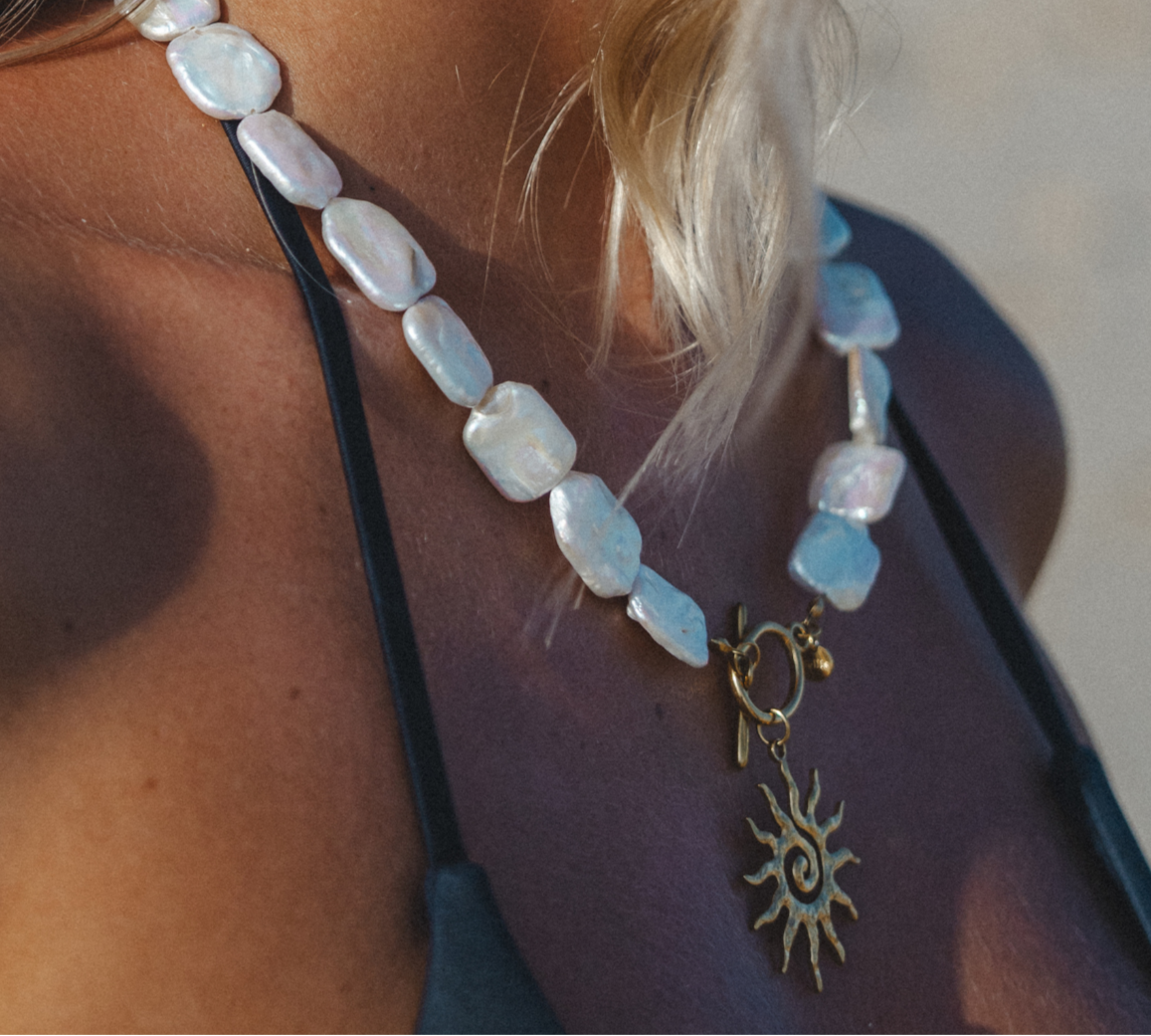 Sienna - Collier perles d'eau douce irrégulières pendentif soleil 18 carats
