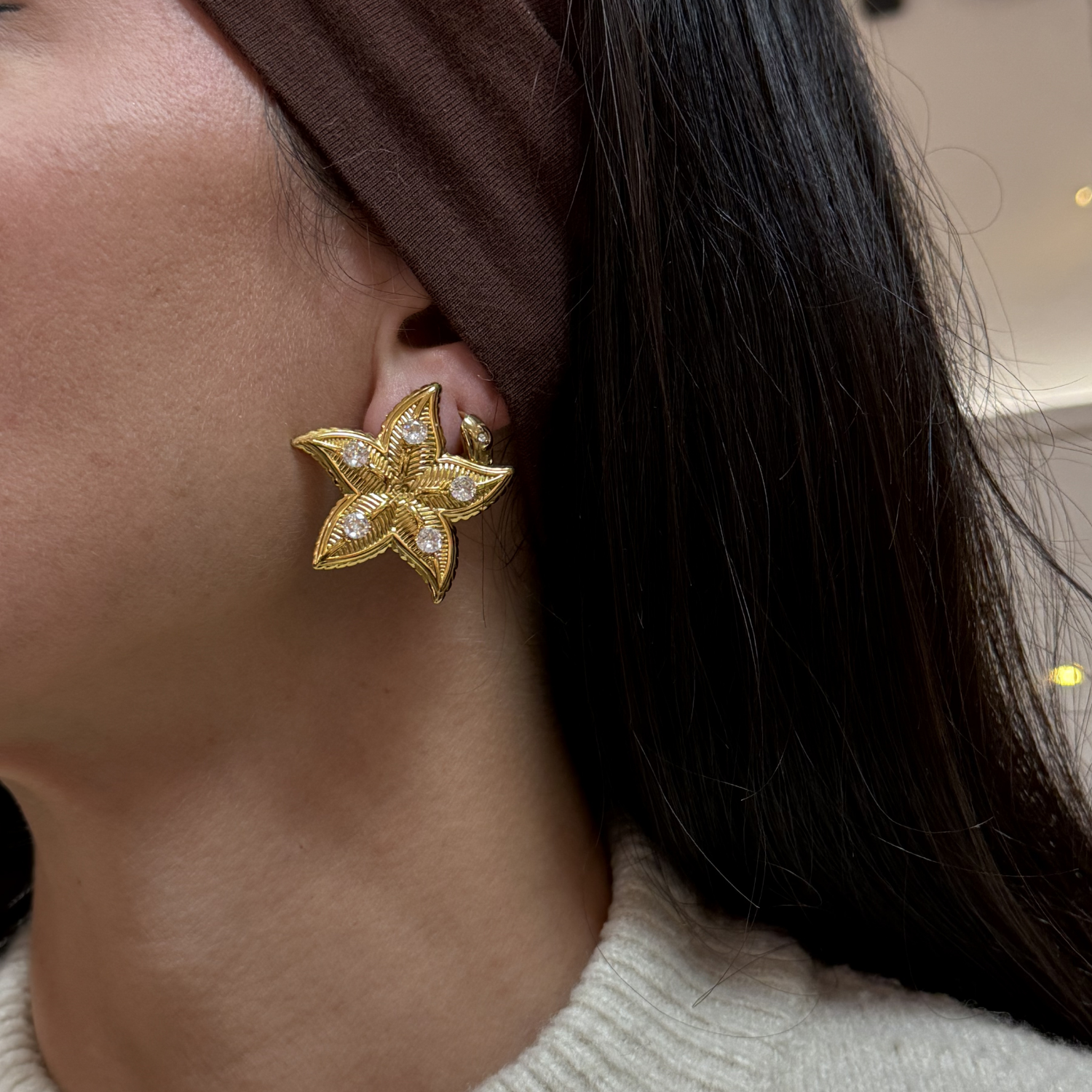 Les boucles d’oreilles Luna en plaqué or 18 carats capturent l’esprit solaire et maritime de la Côte d’Azur. Leur forme étoile de mer, délicatement texturée, est illuminée par cinq strass étincelants qui révèlent leur éclat à chaque mouvement.