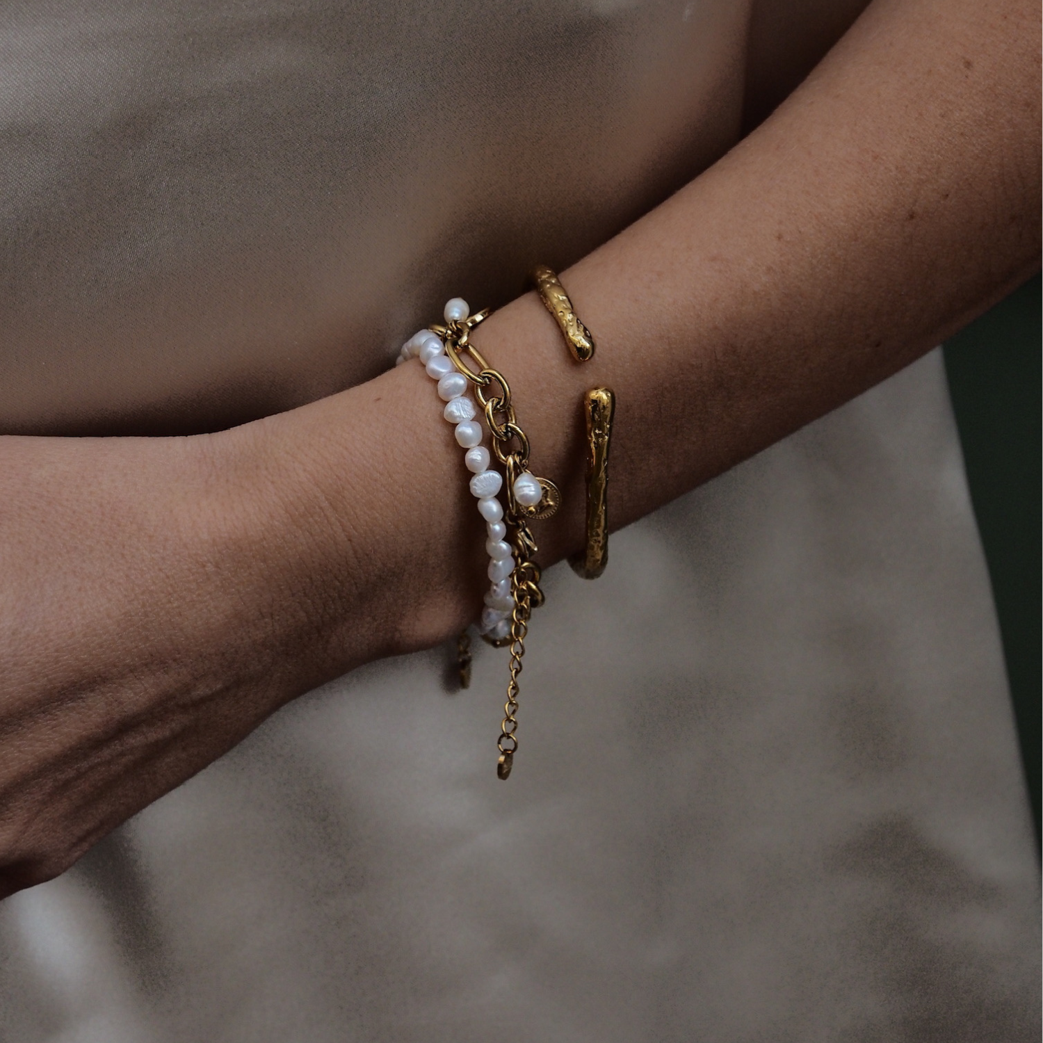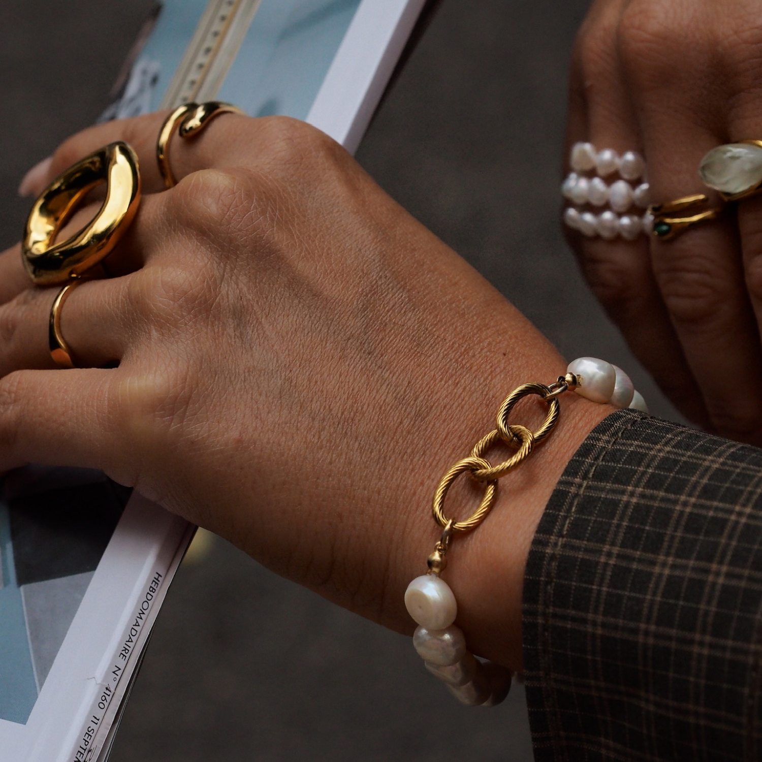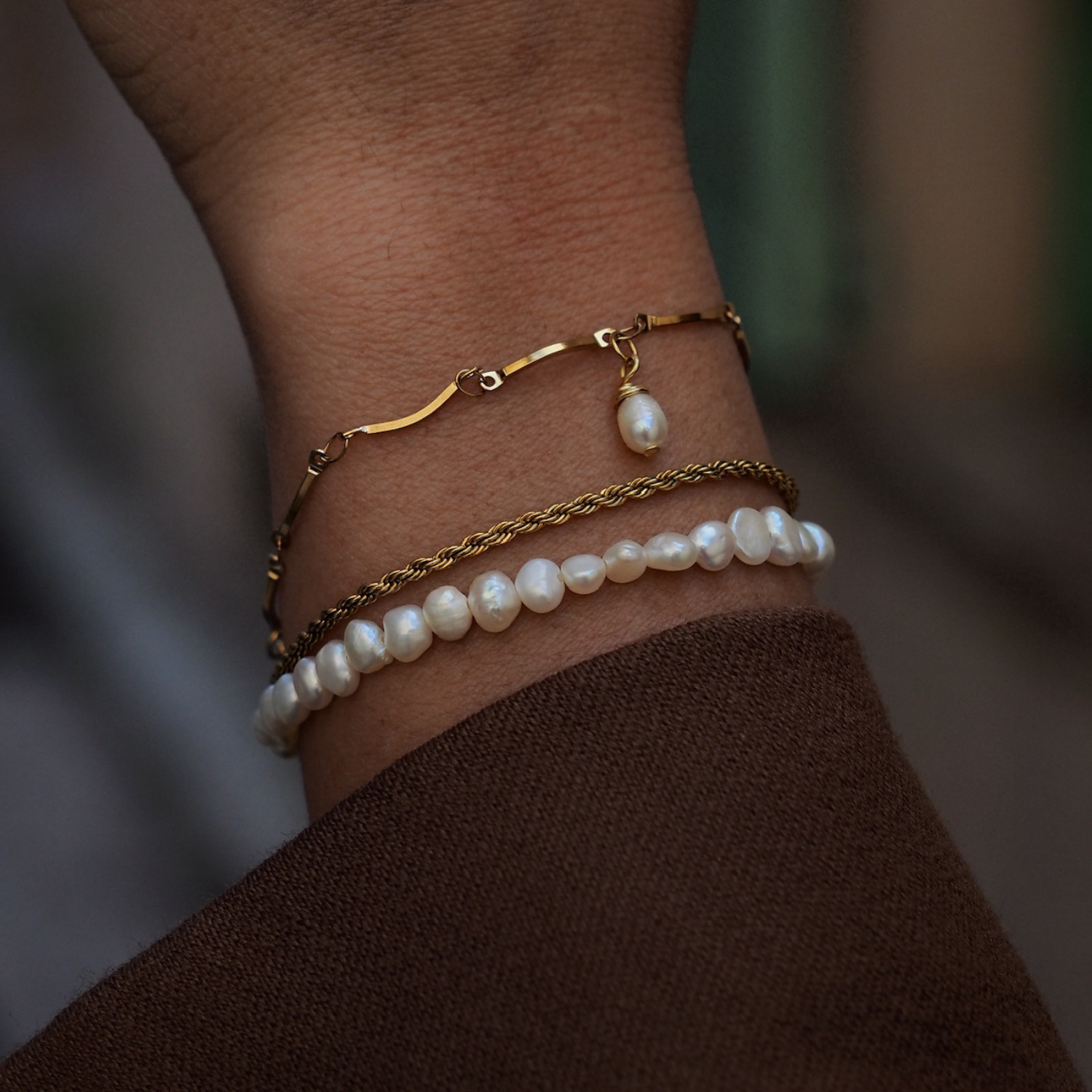 Bracelets dorés, chaînes fines ou perles naturelles : des pièces modernes et discrètes pour le quotidien.