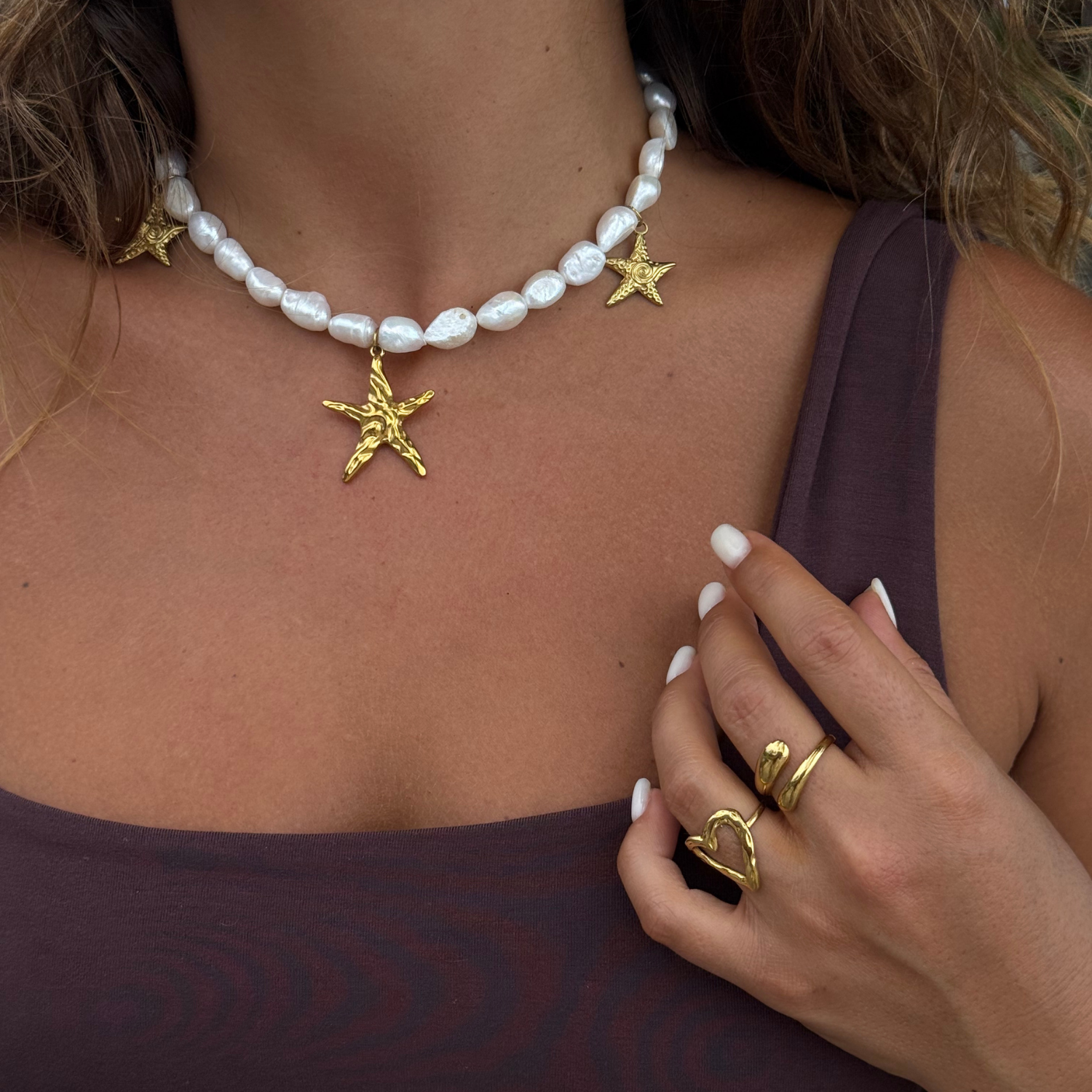 Le collier Stella en perles d’eau douce véritables se distingue par ses trois pendentifs étoile de mer finement sculptés : deux petits et un plus grand, créant un équilibre délicat entre finesse et caractère.