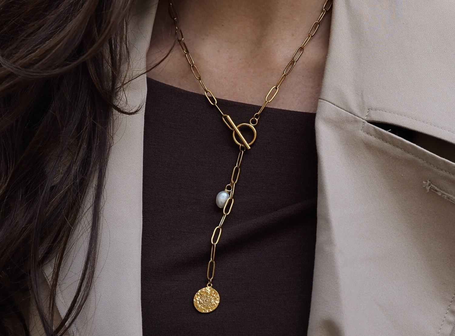 Sa chaîne à maillons en plaqué or 18 carats structure la silhouette, tandis que le pendentif pièce et la perle d’eau douce véritable viennent créer un contraste subtil entre matière brute et détail organique.