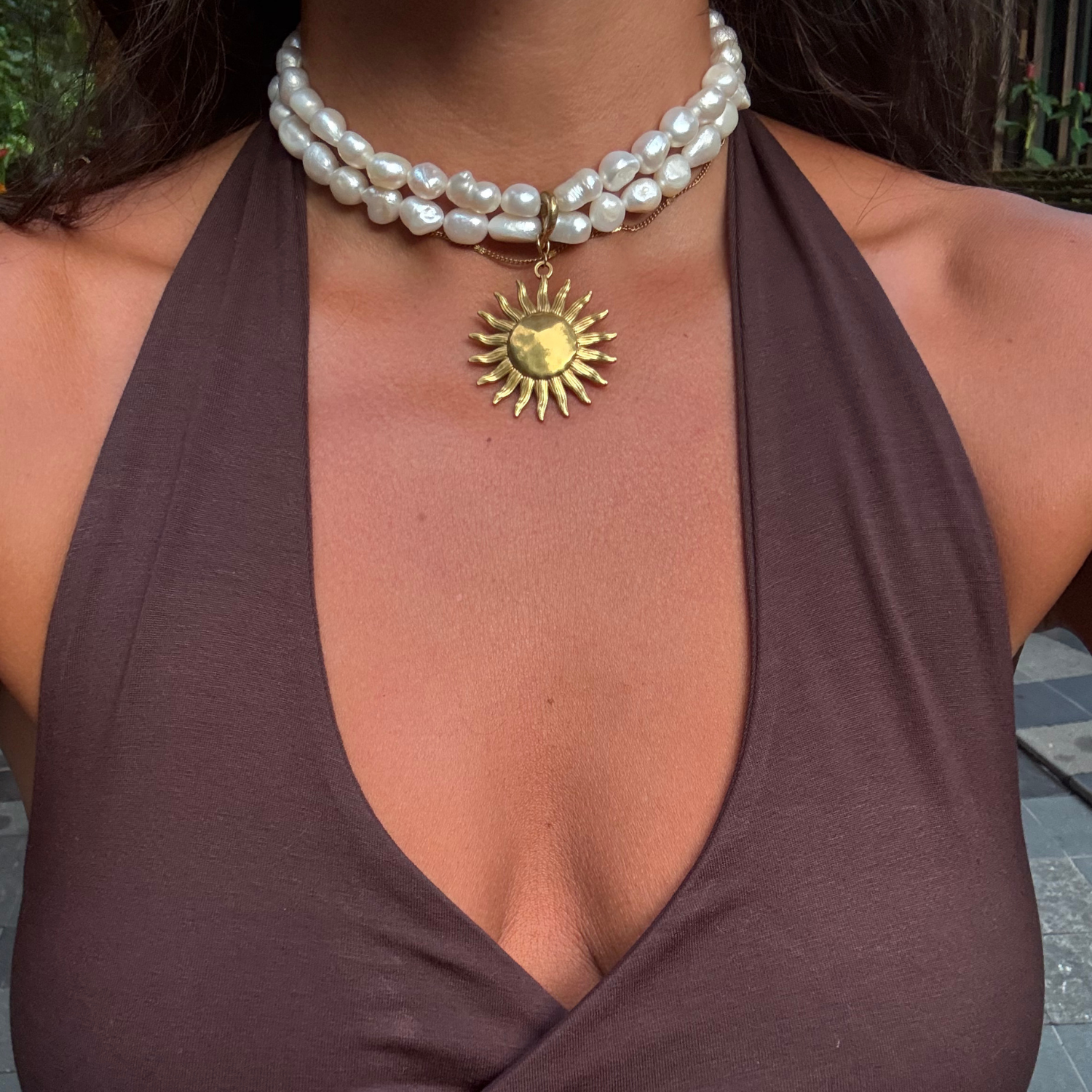 Le collier Irene combine un double rang de perles d’eau douce véritables avec un pendentif soleil sculptural qui capte la lumière.