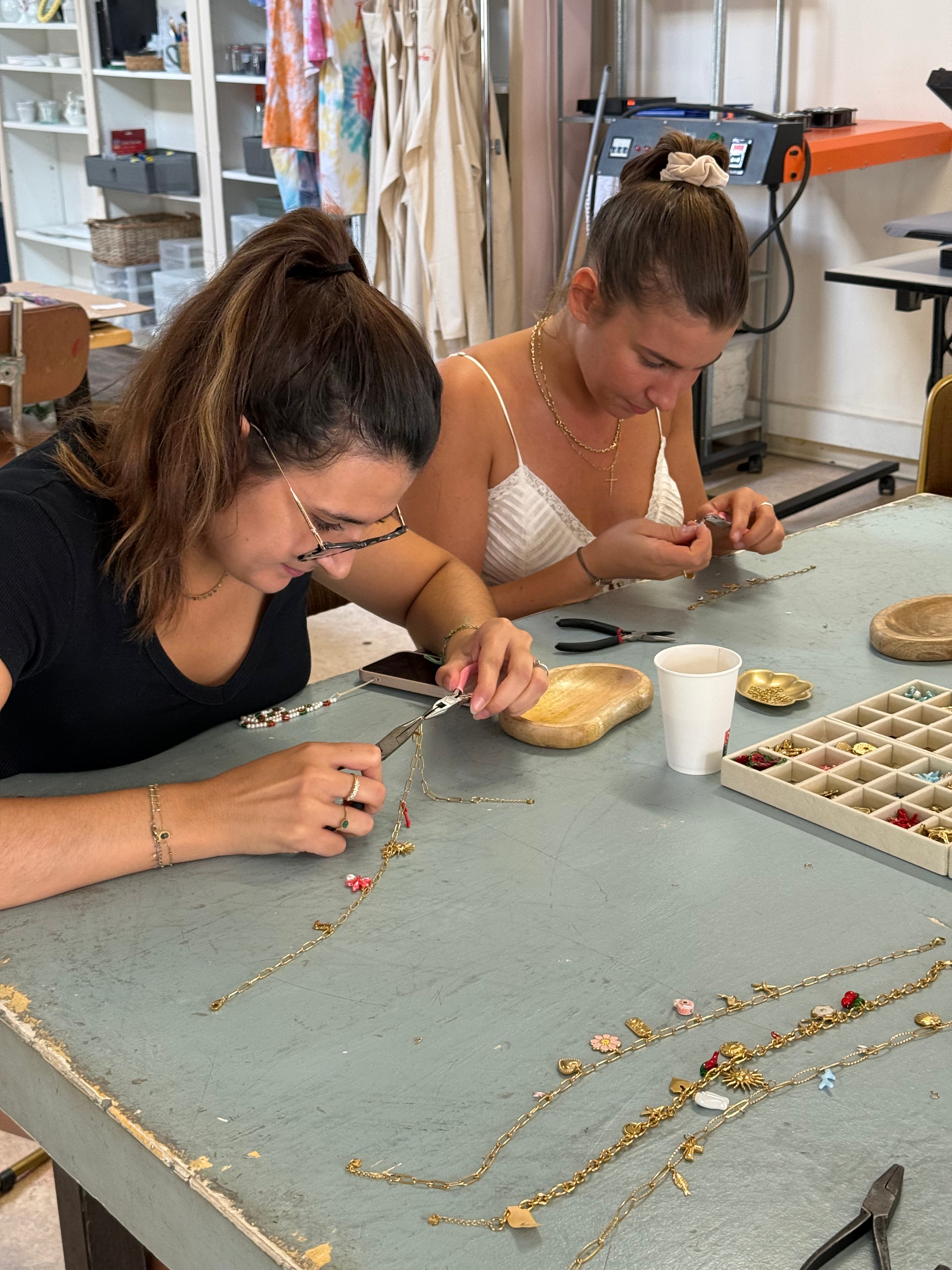Lors de l’atelier, chacun crée son collier à son rythme.