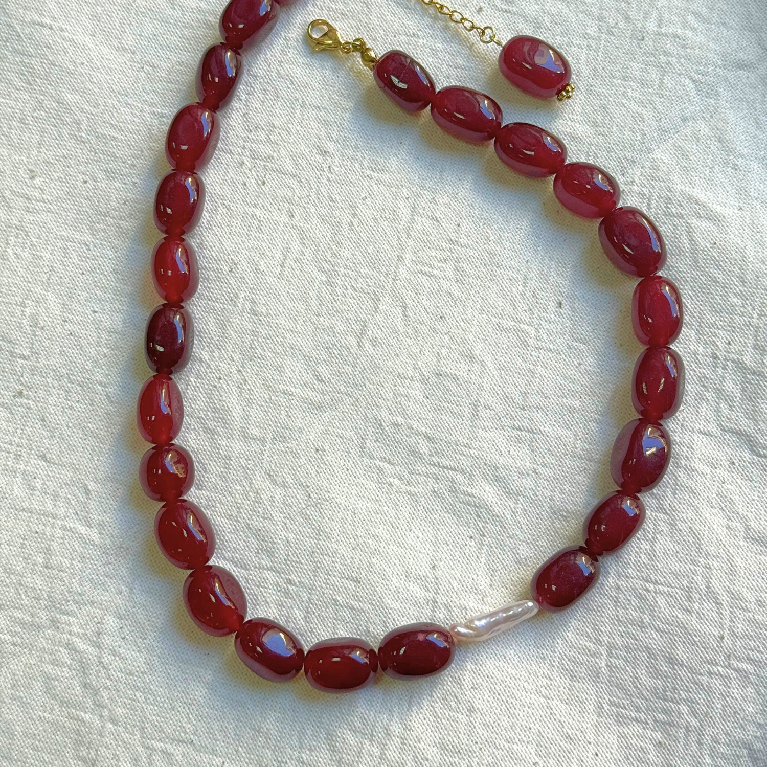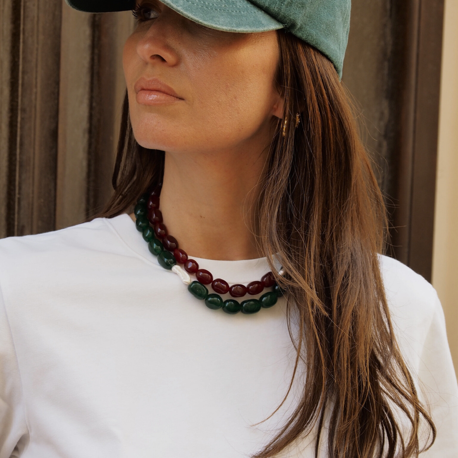 Collier en perles de calcédoine bordeaux ou vert émeraude et en perle d’eau douce naturelle. Un bijou solaire et élégant, qui se porte seul ou en duo.